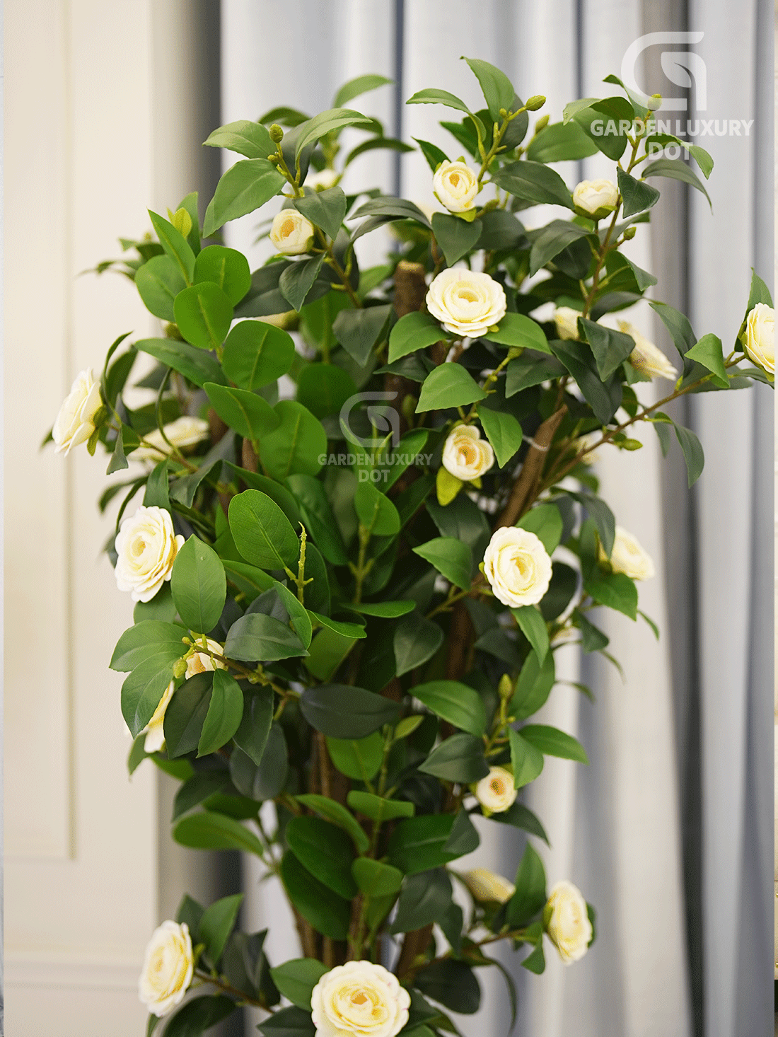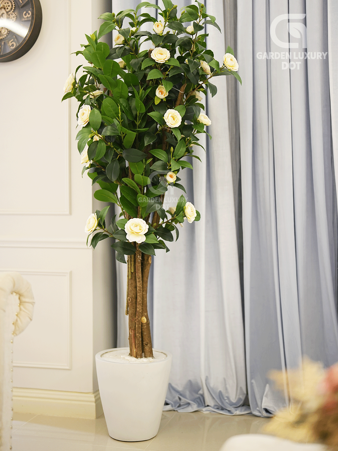 This premium artificial Camellia tree is a perfect choice for home and office décor. The deep green natural-looking leaves combined with soft white-yellow Camellia blossoms bring a refreshing and elegant touch to any space. With its tall height, it fits beautifully in living rooms, reception areas, offices, or lounge corners. The tree comes in a premium fiber pot filled with marble stones, giving it a more natural and luxurious look. The flowers are made of washable rubber material, making them long-lasting and easy to maintain. This elegant piece will surely add a stylish and classy vibe to your interior.