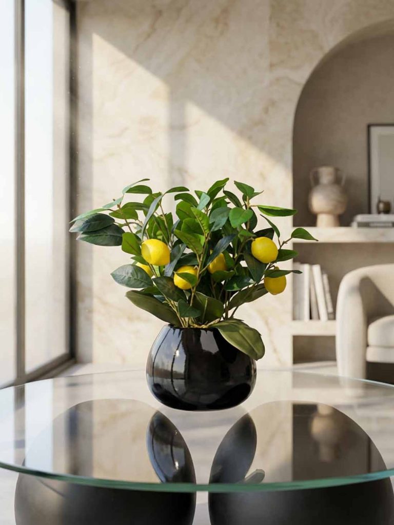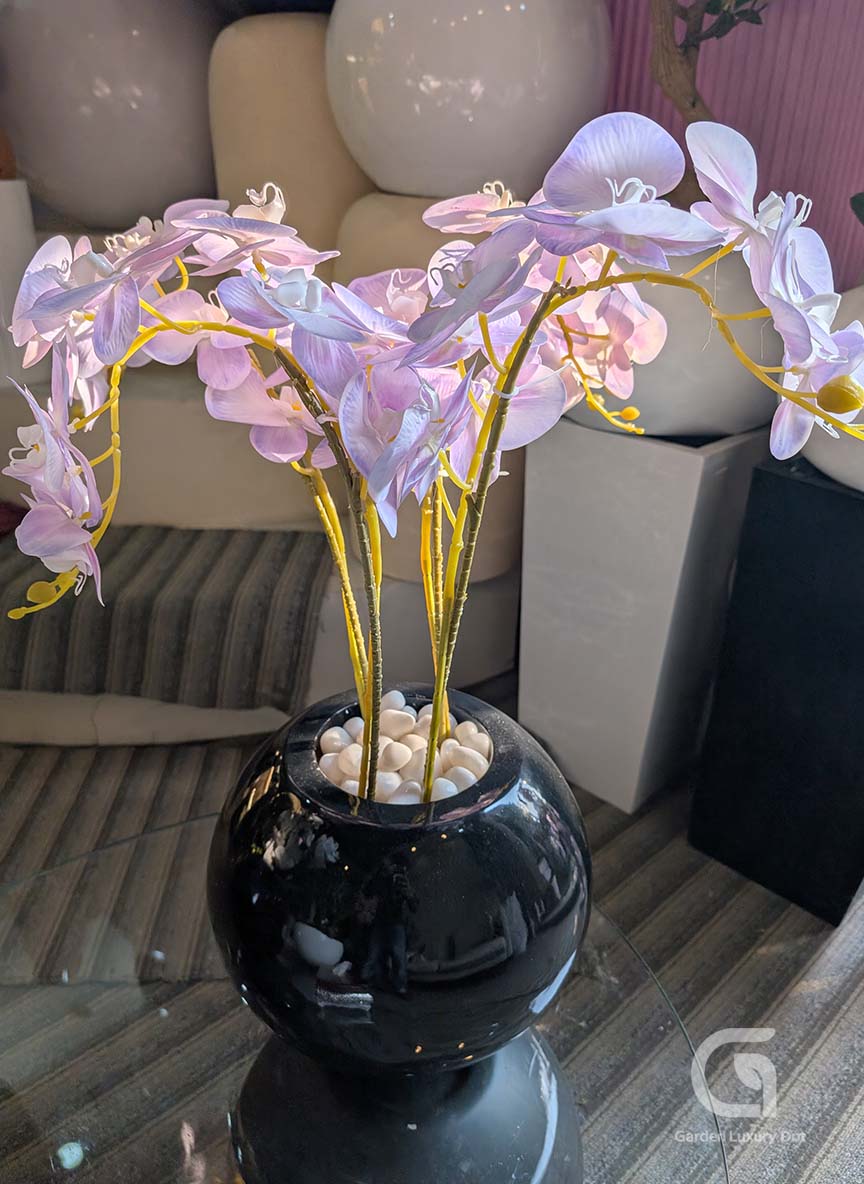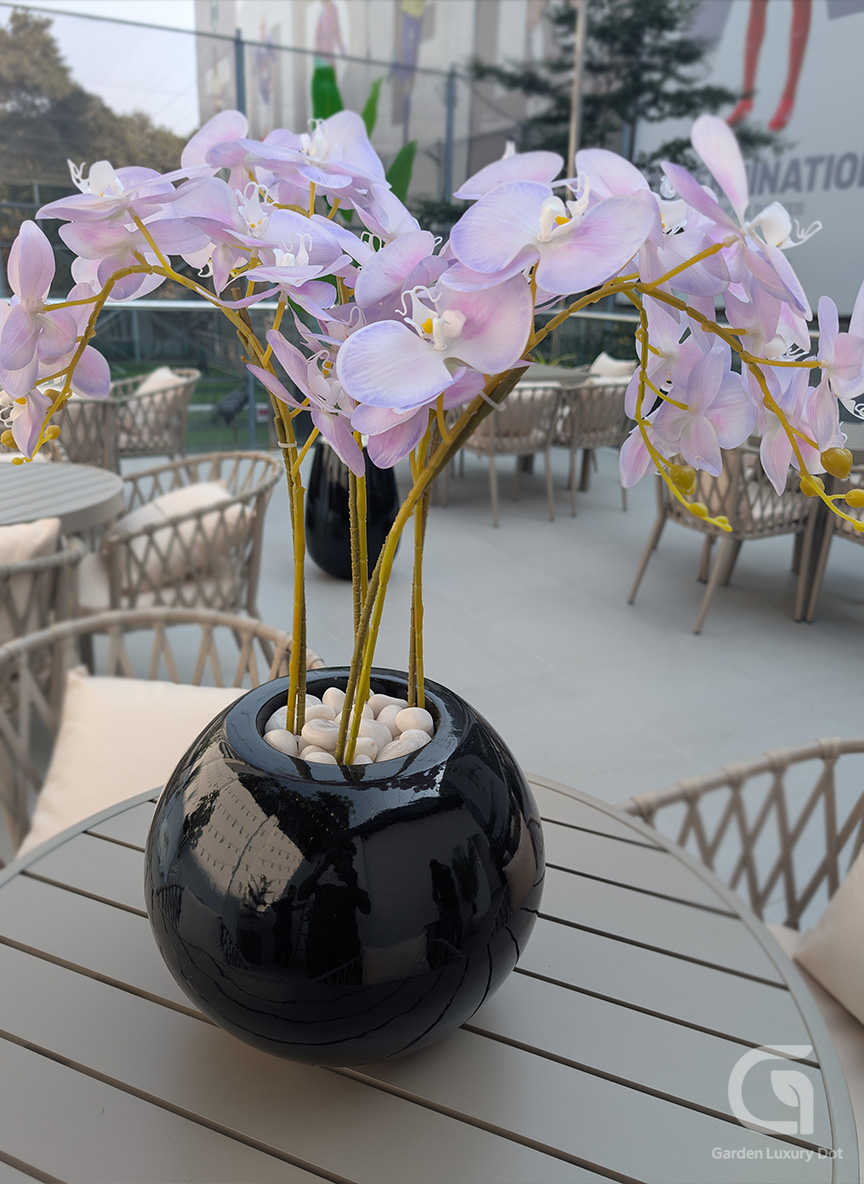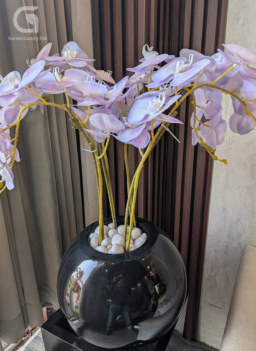 The Royal Orchid Arrangement features elegant lavender orchid blooms paired with a sleek black glossy planter, creating a refined and luxurious tabletop décor piece. It is ideal for dining tables, tea tables, coffee tables, office desks, reception counters, hotel dining areas, and restaurant tables, adding calmness and sophistication to any indoor setting.